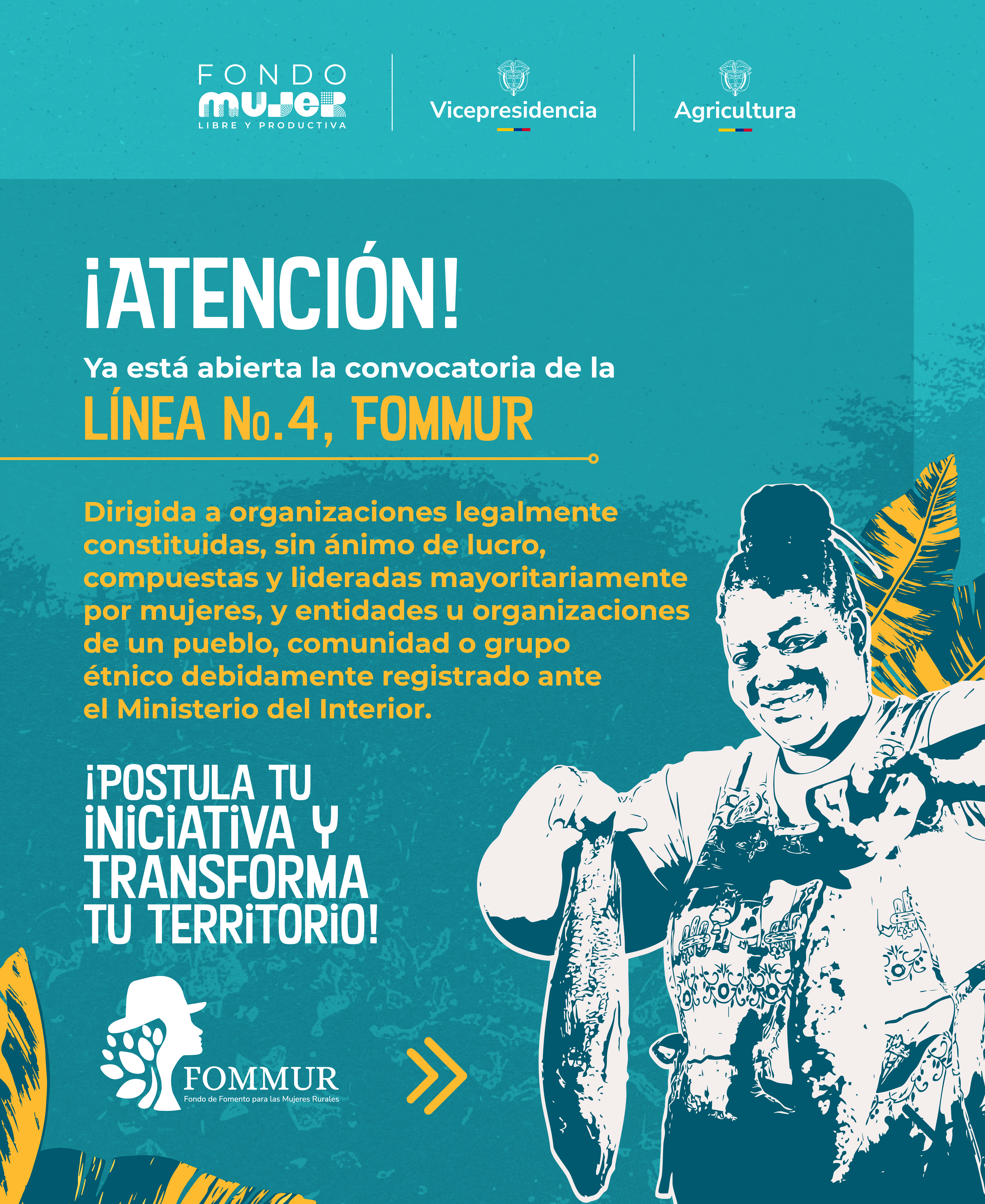 ¿Cuáles son las líneas de Cofinanciación del FOMMUR? En términos generales el Fondo cuenta con cuatro (4) líneas de implementación, de estas, contamos con las líneas 1 y 4 en la que se pueden postular organizaciones de mujeres rurales u organizaciones mixtas, legalmente constituidas o no, y, pueblos, comunidades o grupos étnicos debidamente registradas ante el Ministerio del Interior; a su vez, contamos con la línea 2 dirigida a la postulación de iniciativas por parte de Departamentos y Municipios que por supuesto beneficien mujeres rurales de bajos recursos; y por último, la línea 3 dirigida al apoyo de iniciativas de mujeres rurales individualmente consideras. A su vez las líneas buscan cumplir con el objeto de creación del fondo a través de la cofinanciación de: